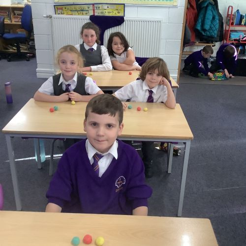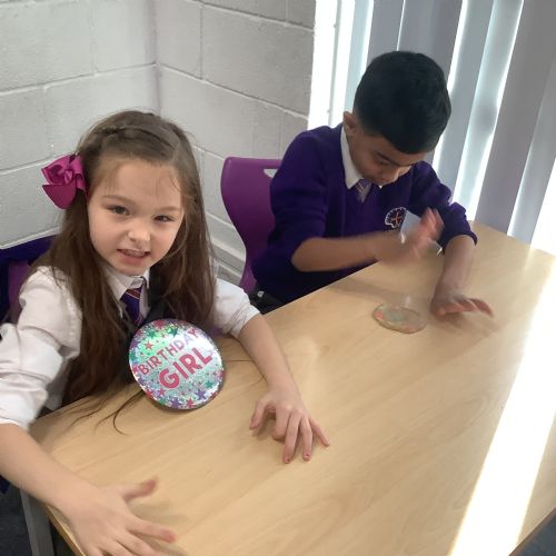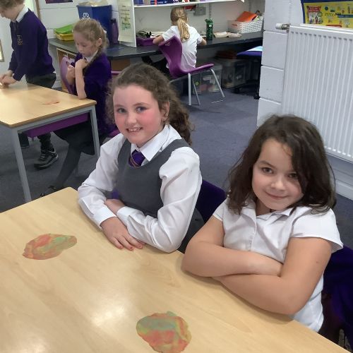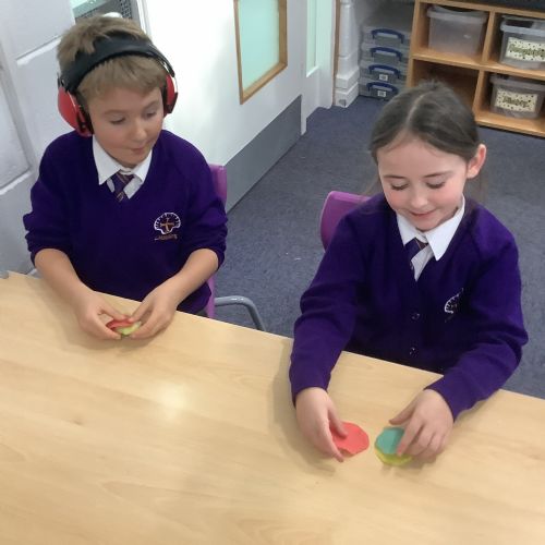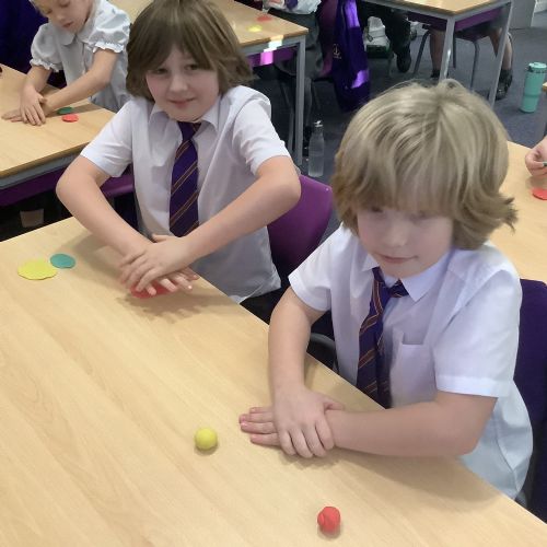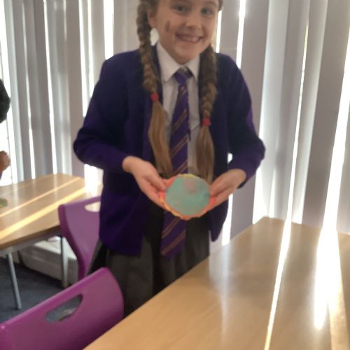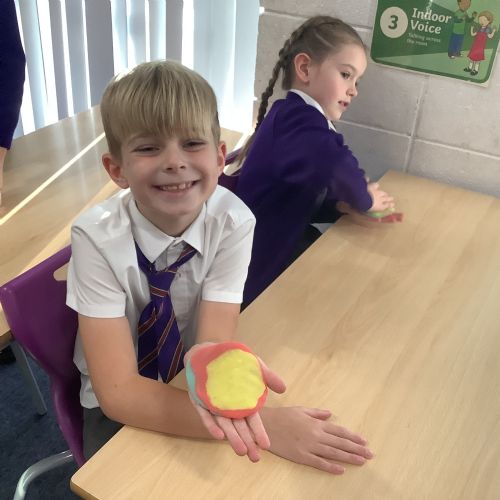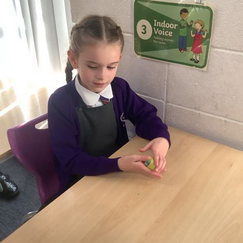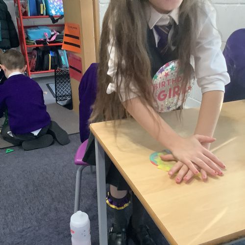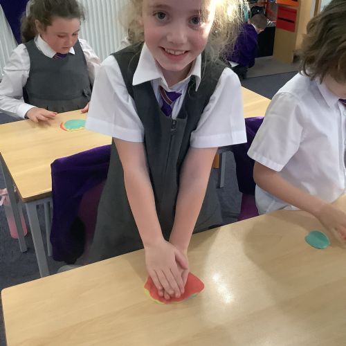 We used heat and pressure to change our sedimentary rocks into metamorphic rock. We warmed our hands to warm the play dough then pressed down hard to create pressure and flatten our play dough. This is what happens over time to create metamorphic rocks.