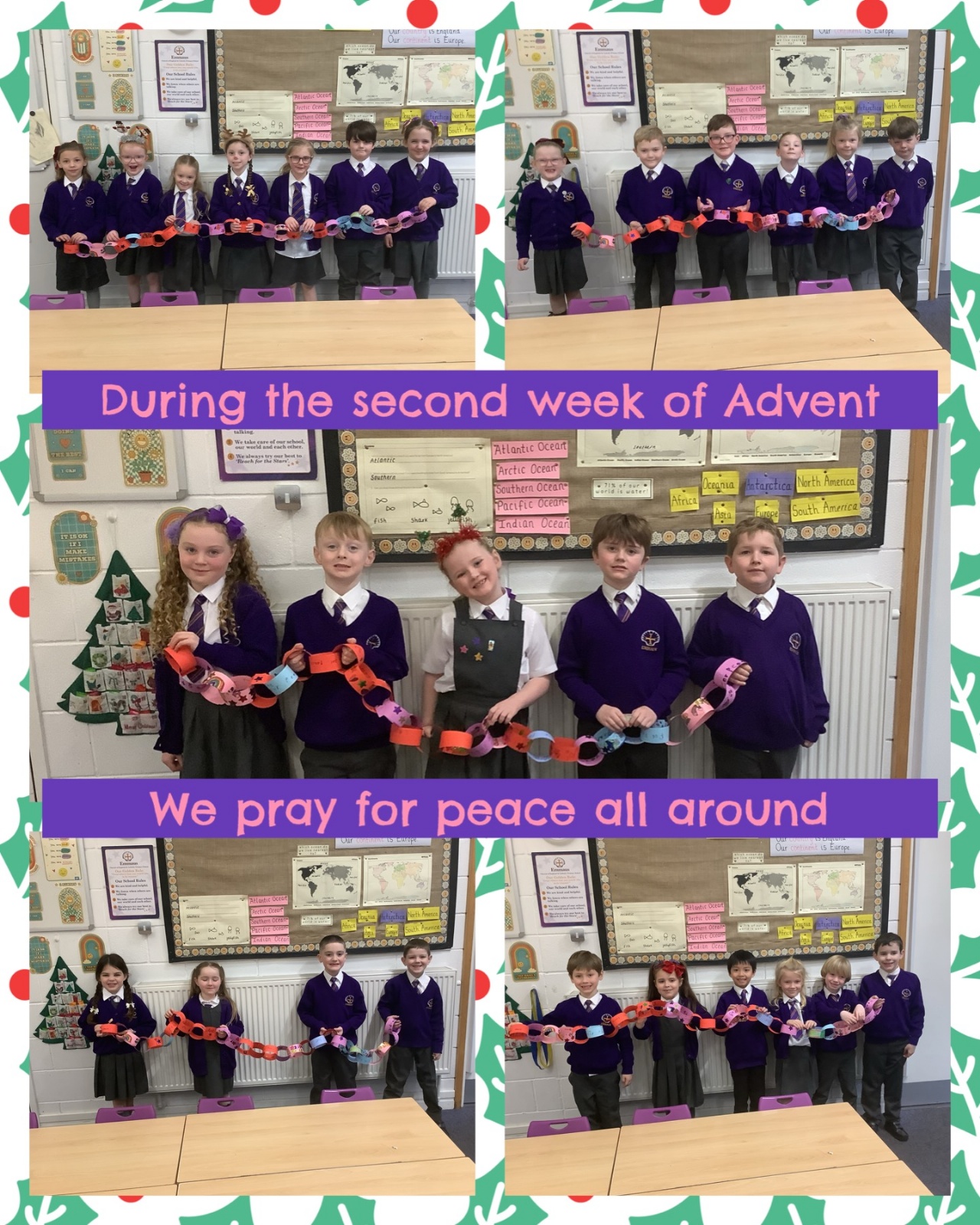 As part of our RE topic, we have been learning about Advent. We looked at how, during the second week of Advent, we should be thinking about praying for peace. We made our own peace chain, all the children made their own individual links saying 'I pray for peace' and then we joined all 30 together!